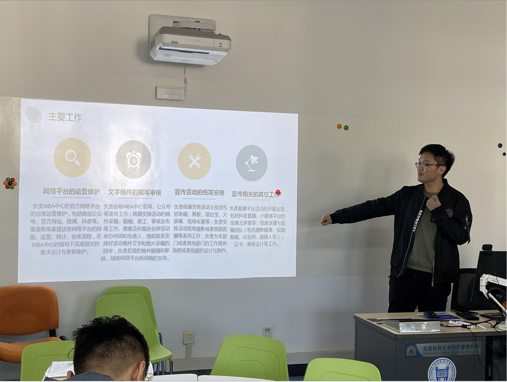 接下来陈部长详细介绍了协同其他部门同学在主席的带领下举办了一场2019年度全北京最好的一场MBA年会,同时也期望下一级的同学们也能为大家奉献一场更加精彩的年会。