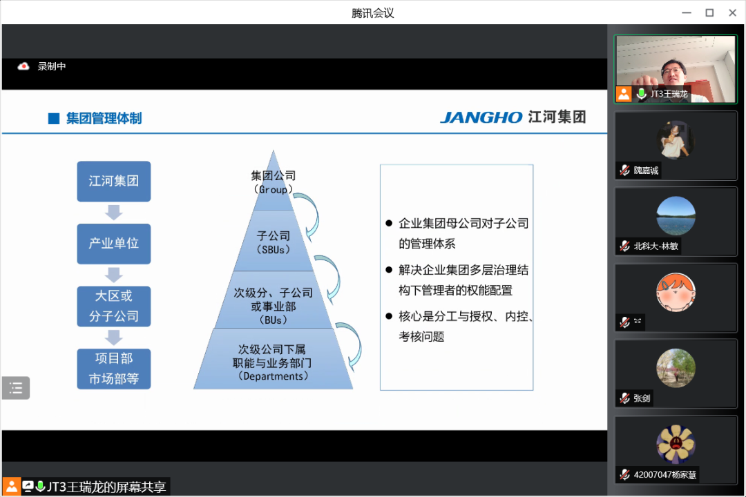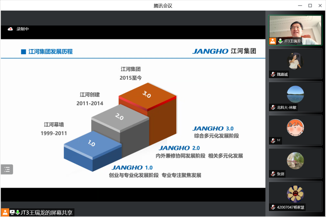7月19日上午,江河集团行政人事总监王瑞龙应邀参加beat365英国官方网站工商管理系2020级企业认识与实践的认识实习,并为同学们精心介绍江河集团的管理体系和人力资源管理模式。本次认识实习共三部分,首先是王总为同学带来主题讲座,其次由集团的部门负责人带领同学在线参观集团的北京工厂与成都公司办公环境,最后由王总与各位同学老师交流互动。工商管理系林敏老师担任主持人,工商管理系系主任张剑,何润宇、尹奎等老师与工商管理系20级全体本科生出席本次活动。