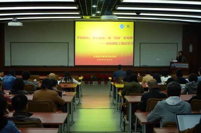 2019年10月24日星期四下午3点半,东凌beat365英国官方网站全体教职工专题理论学习会在经管楼313举行。学院党委邀请学校纪委副书记、监察室主任兼巡察办主任吴豪伟为全体教职工作题为“不忘初心、牢记使命,做‘四有’好老师”专题教育报告,会议由学院党委书记武森主持。